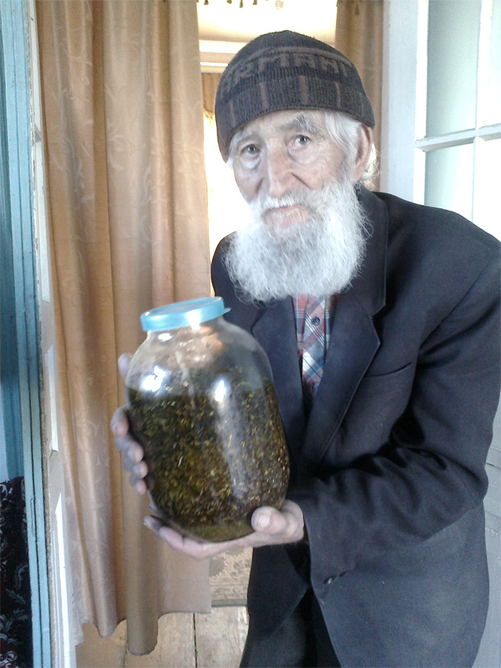 Я захожу в длинный двор, прямой тропинкой прохожу к старому дому, но никого там не встречаю. Хозяина дома обнаруживаю недалеко, на овощных грядках. Это - известный травник Малокарачаевского района Алхаз Кубанов. В свои почти 80 лет продолжает трудиться, обрабатывая землю. Алхаз - человек с удивительно добрым взглядом, обаятельной улыбкой и седой бородой, его так и хочется назвать «дедушка».