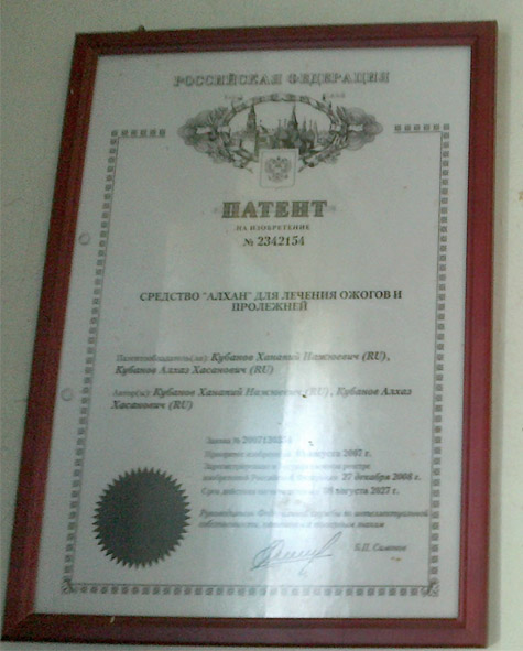 В 2007 году Алхаз Хасанович получил патент на изобретение лекарства «Алхан», которое среди его средств является самым популярным. Оно представляет собой смесь семи трав с добавлением нерафинированного подсолнечного масла, спиртового раствора, раствора для инъекций новокаина, анальгина, сока алоэ, ментола. Используется средство в основном для заживления ожогов и пролежней. Особая его ценность в том, что оно не имеет побочных эффектов. Дедушка рассказывает, как однажды в одной из аптек решили приготовить эту смесь для продажи, не зная при этом соотношения частей, что является одним из основных моментов при смешивании. В итоге один из покупателей пришел с претензией к травнику: мол, твое лекарство не помогает. Тот лишь развел руками, он ведь не причем, не он же его приготовил… Сейчас в очереди на патент стоят еще несколько лекарств, одно из которых, предназначенное для лечения от бешенства, приедут изучить исследователи с Дальнего Востока. В оформлении бумаг ему помогают его племянник и академик А. Бурага из Москвы.