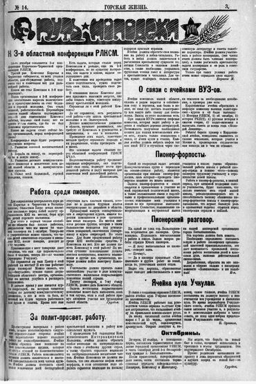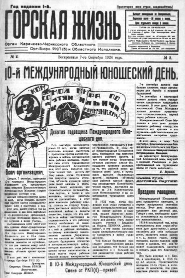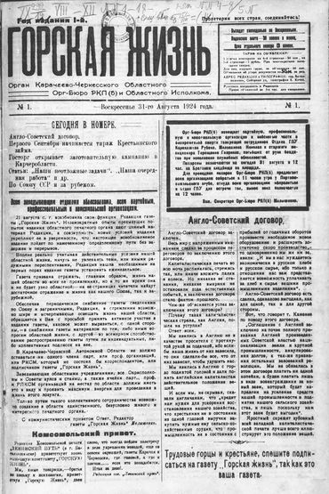 Попытки наладить в Карачаево-Черкесии выпуск местной газеты в течение нескольких лет заканчивались для областных властей неудачно. "Известия Советов народных депутатов Отрадного отдела", "Красные горы Кубани", "Баталпашинская правда", "Красные горы", "Горская беднота" - полет первых ласточек местной прессы Карачаево-Черкесии обрывался смутой Гражданской войны, экономической разрухой и острым недостатком грамотных специалистов. 75 лет назад, в марте 1924 года, вышел в свет "специальный номер для беспартийных конференций" - газета "Горская жизнь" с параллельным текстом на русском и карачаевском языках. Следующий номер печатного издания появился в КЧАО только пять месяцев спустя - в последний летний день 1924 года. В передовой статье вновь созданной газеты редактор "Горской жизни" Николай Малышенко призывал молодую аудиторию: "В КЧАО не должно оставаться ни одного члена <...> РЛКСМ, который не состоял бы корреспондентом или подписчиком газеты "Горская жизнь". Вскоре лозунг о всемерном участии комсомола в работе прессы был подхвачен и редакциями первых национальных партийных газет области - черкесской "Адыге псаучья" и карачаевской "Таулу джашау".