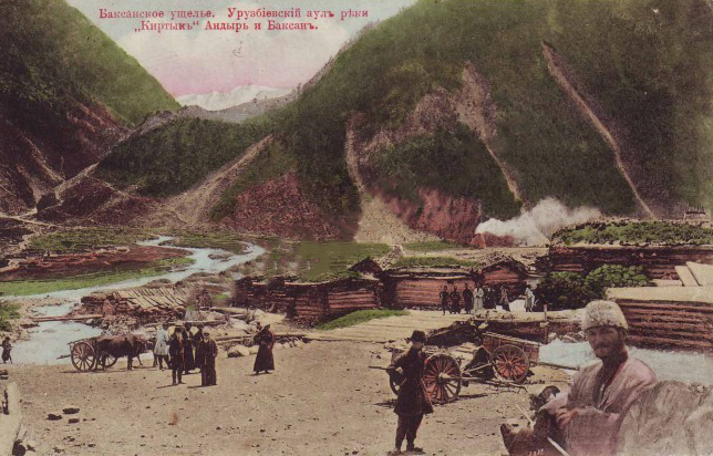 Дома как и снаружи, так и изнутри, производят мрачное впечатление. Однако в полное удивление приводит чистота и свежесть жителей, особенно если до этого побываешь в Сванетии. Уму непостижимо, как им удается соблюдать чистоту, свежесть и оставаться в хорошем расположении духа, проживая в таких своеобразных домах. Жители аула мусульмане, хотя руины церквей в византийском стиле, которые попадались нам на пути, говорят о том, что христианство проникло в эти горы раньше. В Баксанском ущелье, так же как и в параллельном Чегемском, проживает народ, известный нам как горные татары или же таулу. Они очень любят учиться, и, как и во всех других крупных поселениях, в ауле Урусби есть школа, которой руководит местный мулла. В школе кроме Корана на арабском языке преподаются также элементарные предметы и татарский язык (видимо имеется в виду родной язык - прим. пер.).