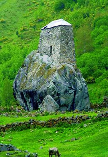 По легенде, нартский богатырь Сосрукъ был рождён из камня. Другой нартский богатырь Ёрюзмек был занесён на землю небесным камнем - метеоритом. В карачаево-балкарском нартском эпосе, да и в литературе много приемов, когда целостный образ народа подается в образе камня. Например, "Раненный камень" К. Кулиева о трагической судьбе нашего народа во время депортации. Образ камня в жизни и поэзии горца - явление совершенно естественное. Это как берёзка в русской культуре. Поэты и путники, охотники и животноводы часто "беседовали" с камнем, вверяя ему свои иногда горькие, а иногда радостные мысли. Горец помнил всегда, что камень - самый древний свидетель всего, что происходило на земле. Хочется отметить, что туристы окрестили наш народ "южными викингами". Каждый ландшафт заставляет людей (субэтнос) приспосабливаться к его особенностям. То же самое можно сказать о способах хозяйствования, особенно в выборе материала для строительства.