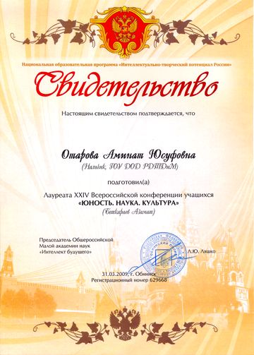 - В этот раз я ехала уже на конкурс юношеских исследовательских работ "Чтения памяти В.И.Вернадского" со своей ученицей Чочаевой Азизой. Ученица 11 класса Чочаева Азиза в прошлом году заняла первое место в XVI республиканской конференции молодых исследователей в секции "Психология", ей присудили Диплом I степени, но мы не смогли поехать тогда в Москву. В этом году, на XII республиканской научной конференции школьников "Чтения памяти В.И.Вернадского" заняли II место, работу отправили в заочный конкурс и прошли первый тур, после были приглашены на очный тур, который прошел в Москве с 13 по 17 апреля 2009 года.