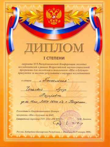 - Это произошло в прошлом году. Я со своей ученицей Джаппуевой Джамилей выполнили работу по психологии, в которой исследовали факторы отрицательного воздействия стресса на здоровье. Заняла I место на республиканской конференции "Сигма" и работа была отправлена на заочный тур Всероссийской конференции "Юность. Наука. Культура", где была отмечена дипломом II степени. На очном туре Джамиля став лауреатом I степени, получила золотую медаль за лучшую работу в секции.