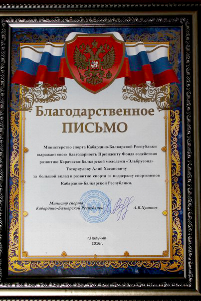 Министерство спорта Кабардино-Балкарской Республики выражает свою благодарность президенту Фонда содействия развитию карачаево-балкарской молодежи "Эльбрусоид" Тоторкулову Алию Хасановичу за большой вклад в развитие спорта и поддержку спортсменов Кабардино-Балкарской Республики.