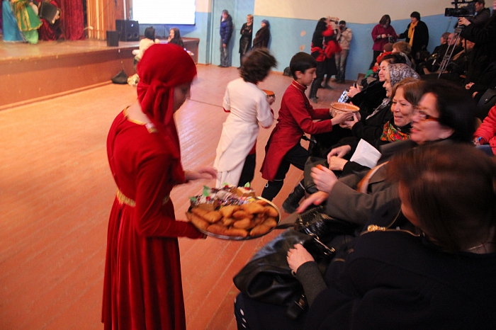Потом был танец Озай. Ряженные ребята и девушки ходили по залу. Мальчики пытались испугать зрителей и получить выкуп, а девушки предлагали хычыны, лакумы и конфеты.