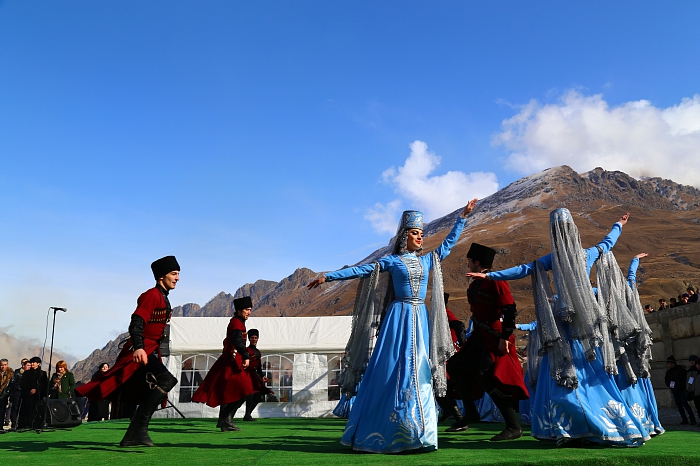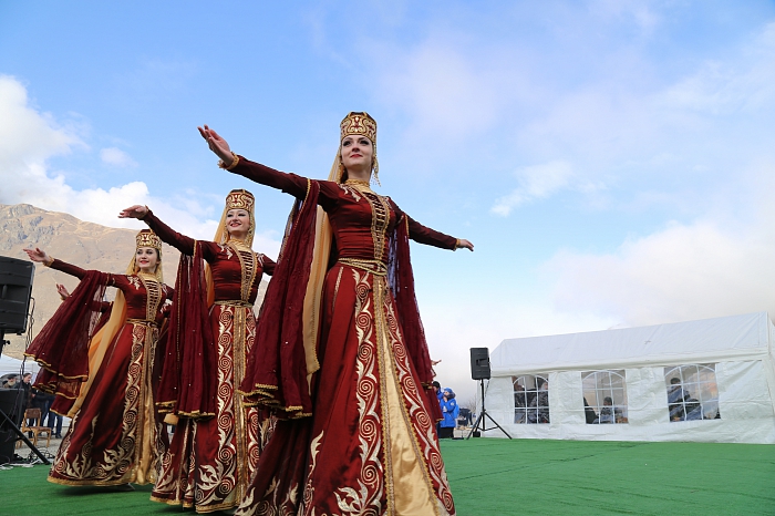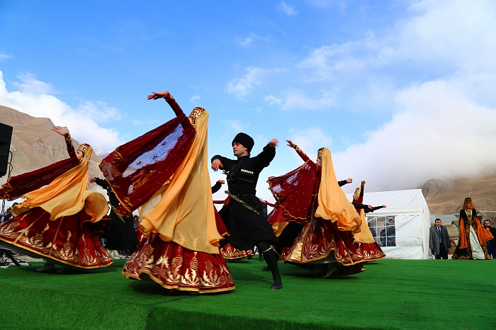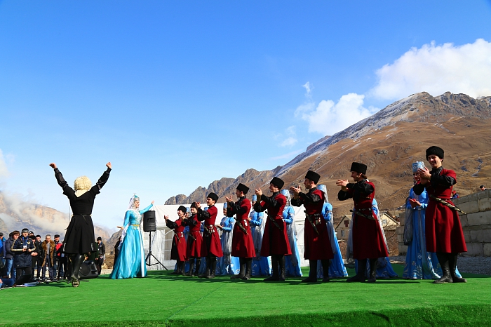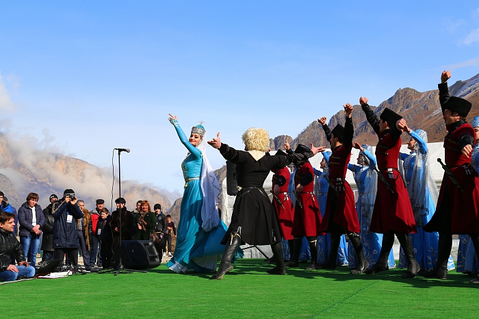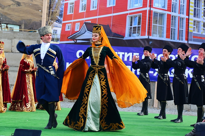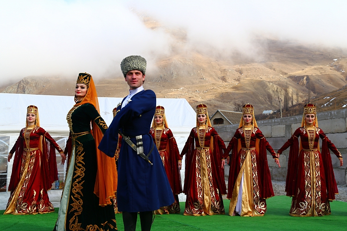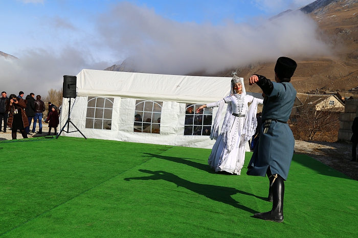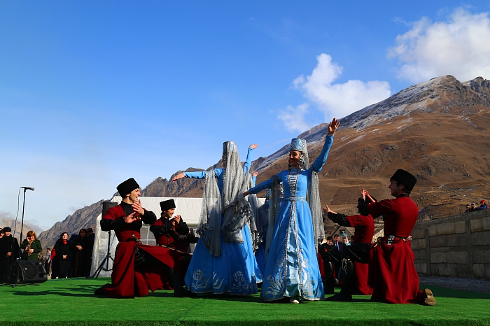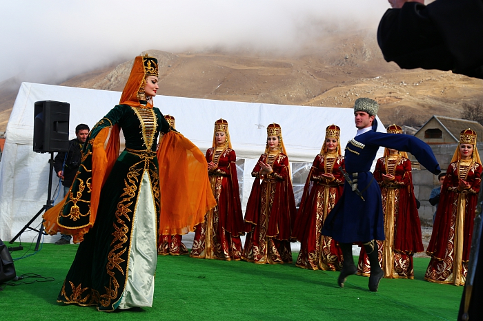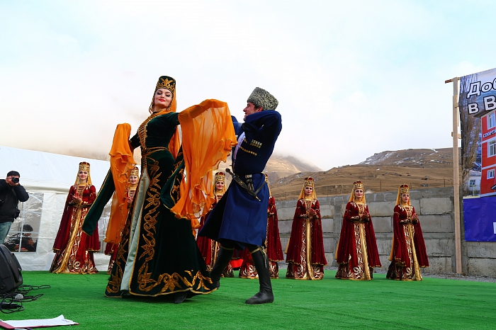 Солисты ансамбля Балкария Рамазан Аскеров и Лейля Гуртуева, танец Къол жаулукъ